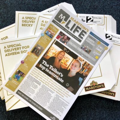 We produce all the monthly news letters for Marston’s Brewery and when they came to us asking for some kind of bespoke packaging, we designed and came up with a concept to produced a box that was personalised for each of their pub managers – this has been a great success and we are now doing more personalisation on packaging for Marston’s and many other of our customers.